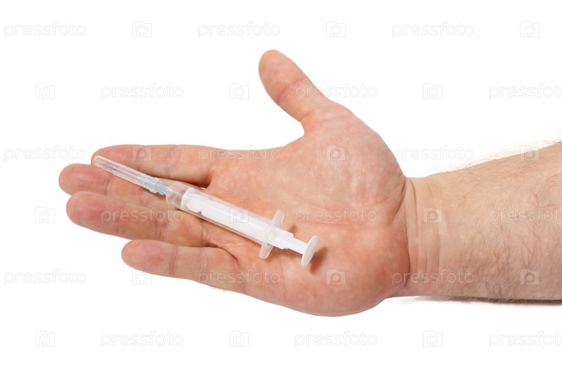Шприц в руке на белом фоне, изолировано