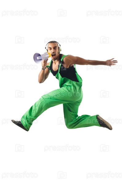 Строительный рабочий прыгает и танцует