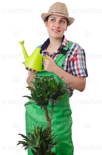 Девушка поливает растения на белом фоне