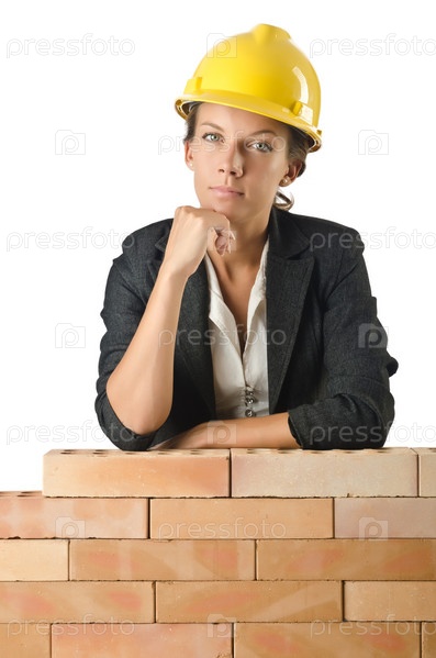 Женщина-строитель у кирпичной стены