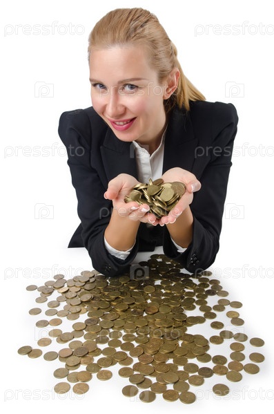Женщина с большим количеством монет на белом фоне