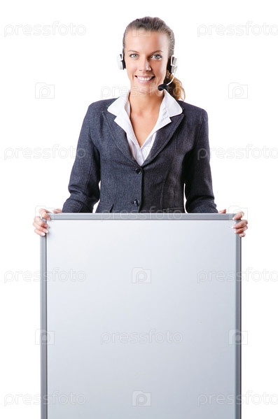 Девушка с пустым баннером и гарнитурой