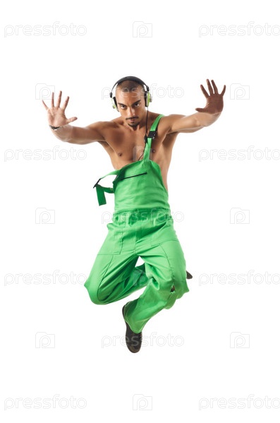 Строительный рабочий танцует в прыжке