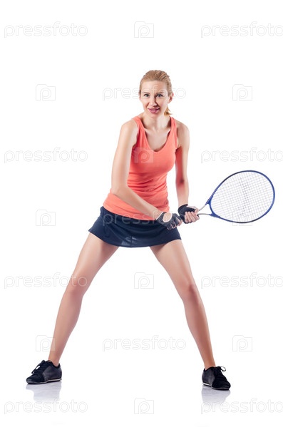 Женщина играет в теннис на белом фоне