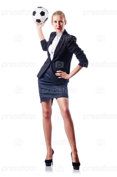 Предприниматель с футбольным мячом на белом фоне