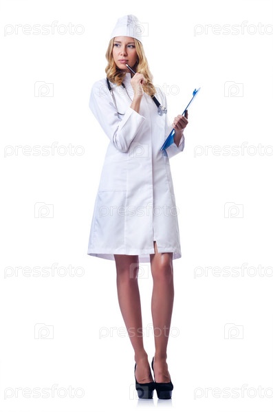 Молодая женщина-врач на белом фоне