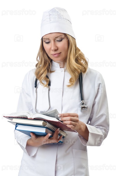 Молодая женщина-врач на белом фоне