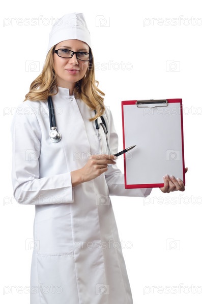 Молодая женщина-врач на белом фоне