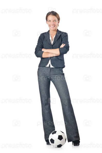 Бизнес-леди с футбольным мячом на белом