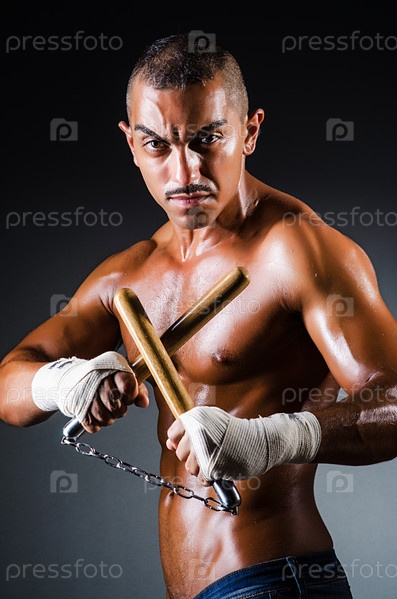 Сильный мужчина с нунчаками