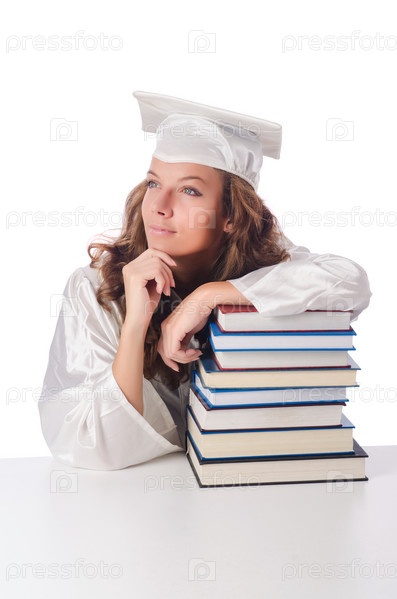 Счастливый выпускник с большим количеством книг на белом фоне