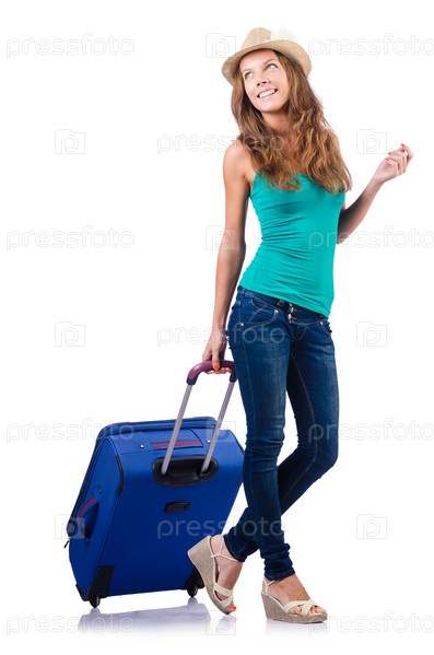 Молодая девушка с чемоданом на белом фоне