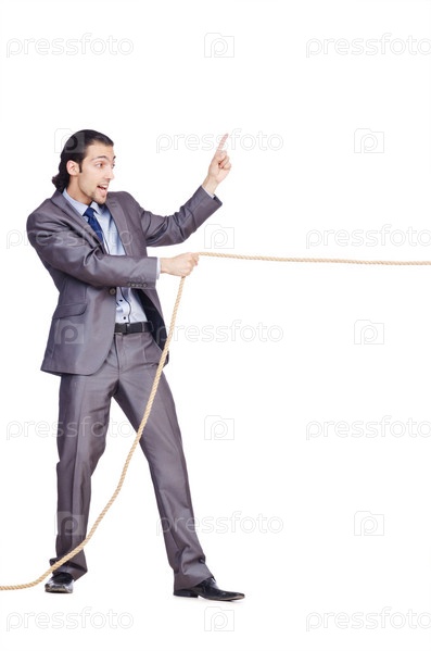 Бизнесмен тянет веревку на белом фоне