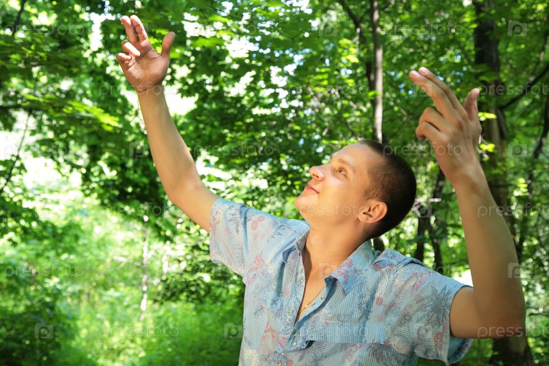 Парень с поднятыми руками на природе