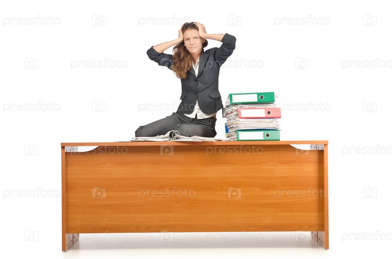 Загруженный предприниматель на белом фоне