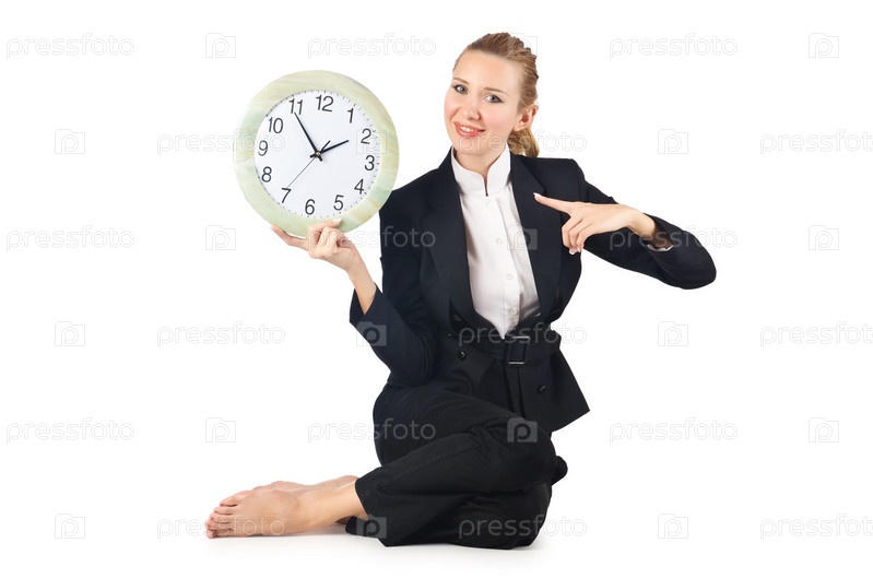 Женщина с часами на белом фоне