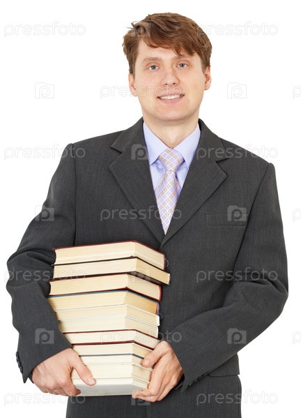 Портрет человека со стопкой книг, изолированного на белом фоне