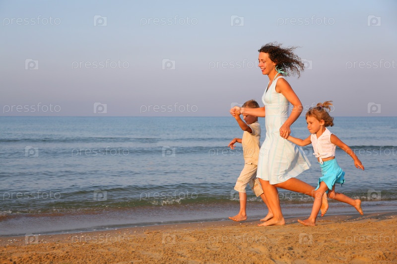 Мама с детьми, бежит по пляжу