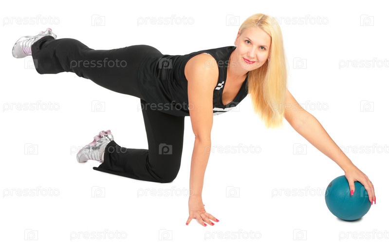 Блондинка делает упражнения с мячом