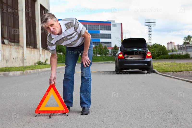 Зрелый мужчина устанавливает предупреждающий треугольник на дороге на фоне автомобиля с мигающими фарами