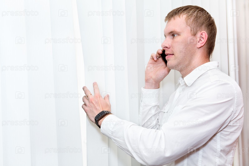 Красивый мужчина стоит возле окна с мобильным телефоном