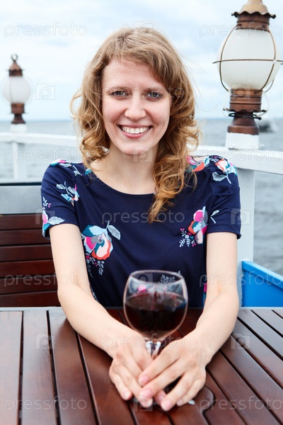 Счастливая женщина в платье с бокалом вина сидит за столом