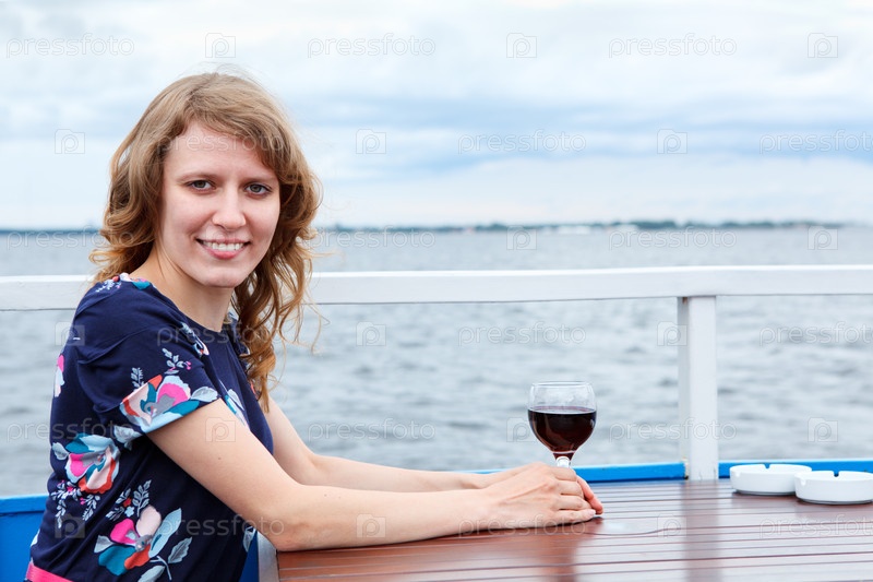 Счастливая женщина в платье с бокалом вина сидит за столом