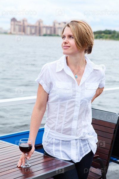 Красивая европейская женщина в белой одежде с бокалом вина стоит у стола в кафе