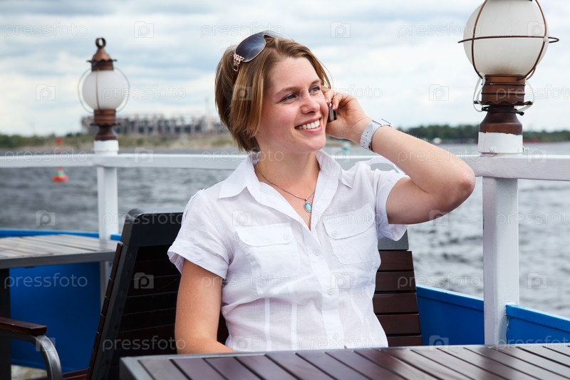Красивая европейская женщина в белой рубашке звонит по мобильному телефону, сидя за столом в кафе
