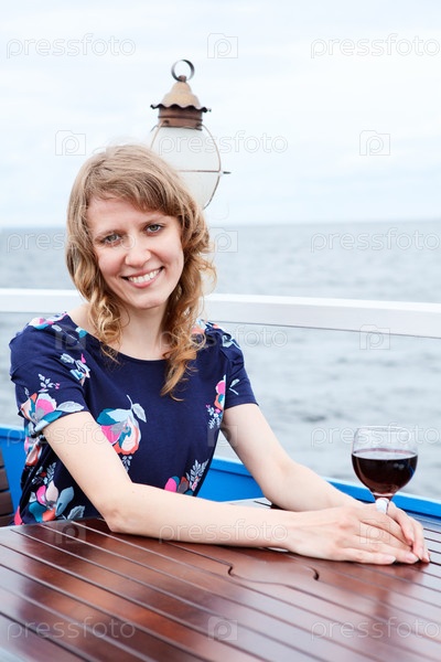 Женщина в платье с сидит за столом с бокалом красного вина