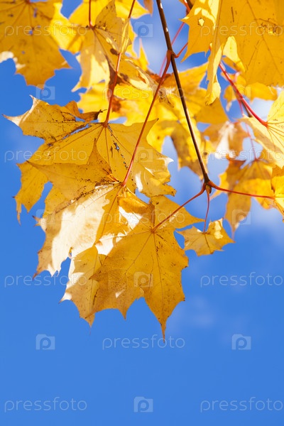 Желтая кленовая ветка на фоне голубого неба
