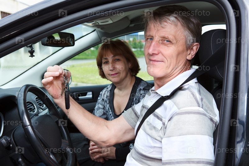 Пожилые европейские мужчина и женщина сидят в автомобиле и улыбаются
