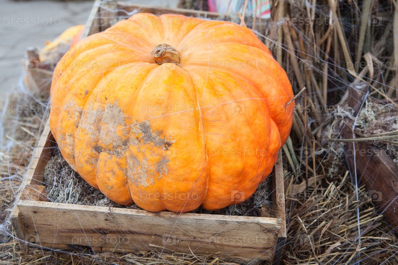 Большая спелая оранжевая тыква в деревянном ящике