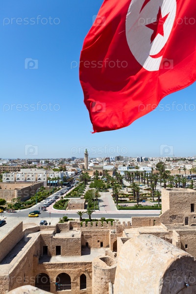 Вид сверху улиц в городе Монастир, Тунис. Минарет мечети и крепость Рибат. Тунисский красный флаг