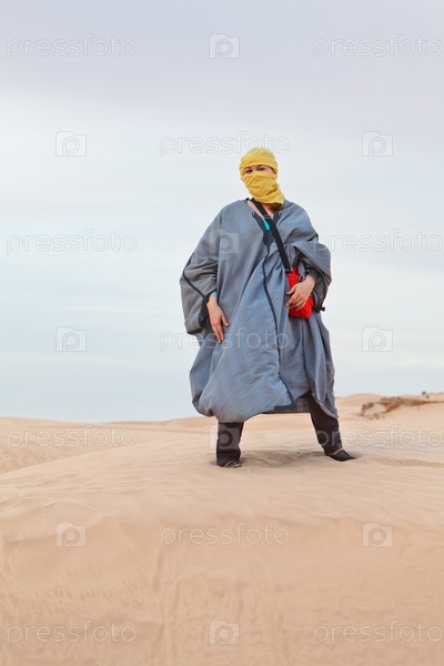 Женщина в одежде бедуинов, стоящая на дюне в пустыне