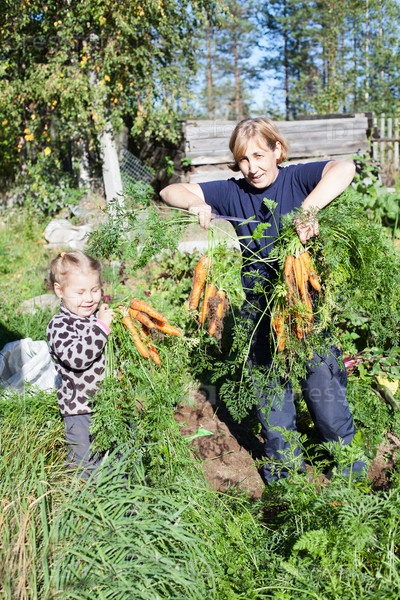 Зрелая женщина с ребенком собирают морковь в саду