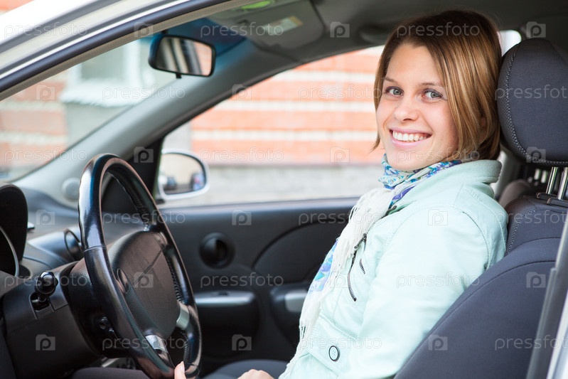 Счастливая женщина внутри автомобиля на сиденье водителя