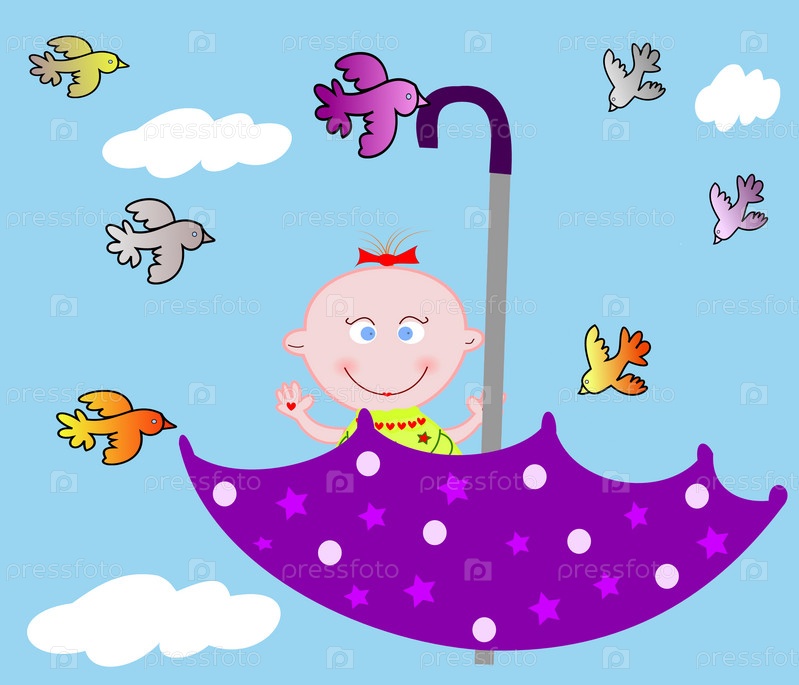 Маленький веселый ребенок в зонтиком на воде с птичками