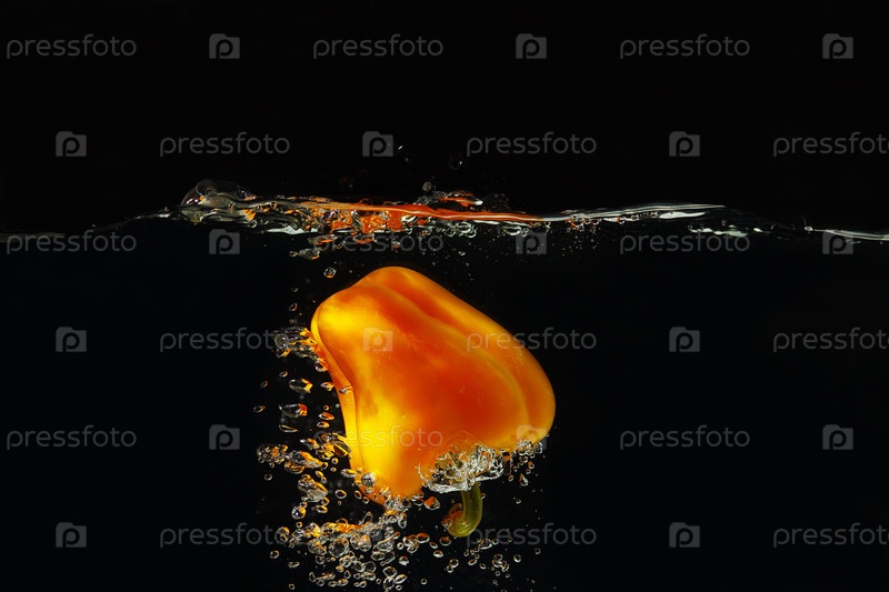 Желтый перец падает в воду с всплеском на черном фоне