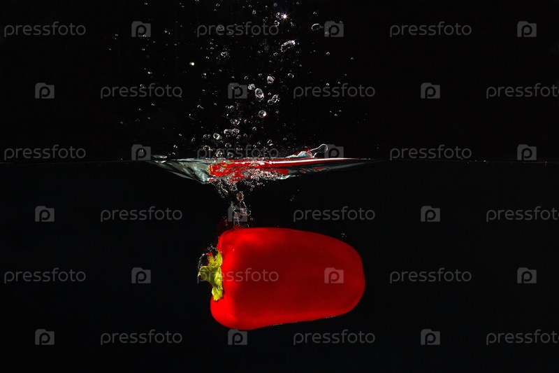 Свежий красный перец падает в воду с всплеском на черном фоне