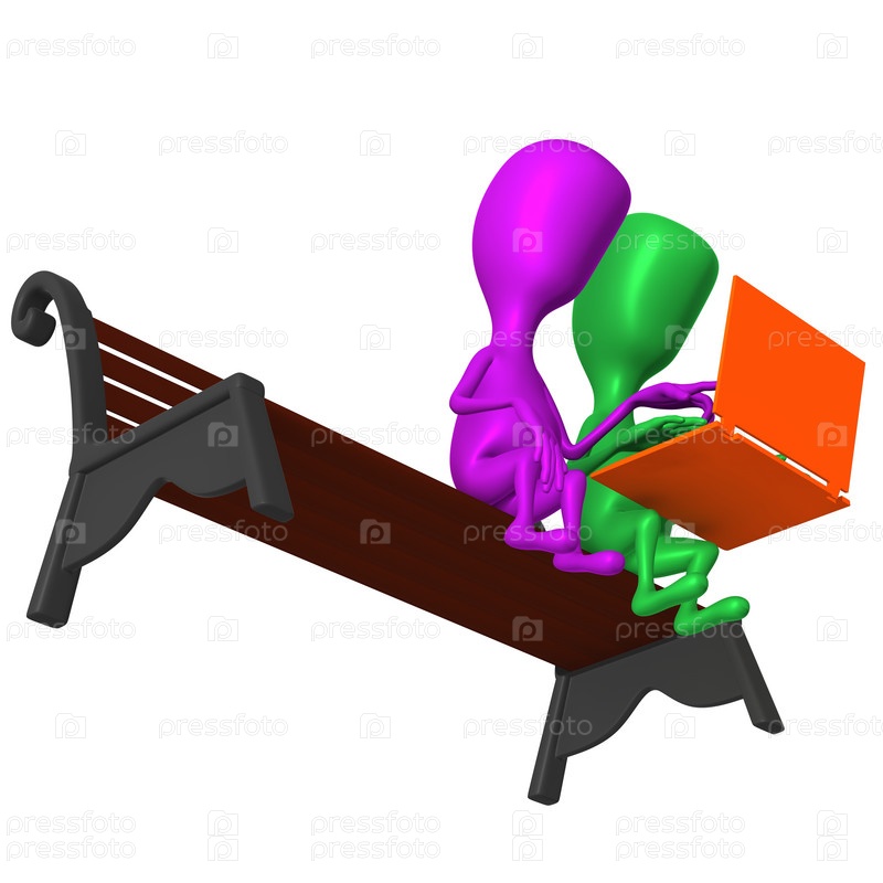 Куклы с ноутбуком обсуждают что-то на скамейке