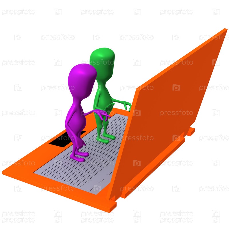 Куклы стоят на огромном ноутбуке