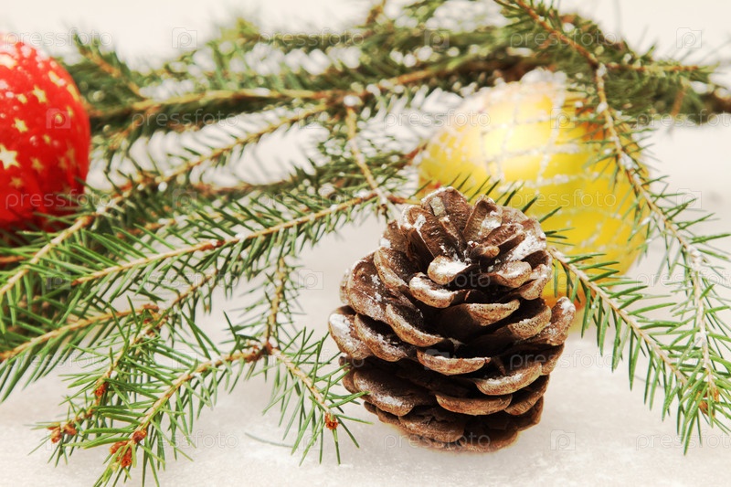 Новогодние игрушки, шишка и снег на еловой ветке