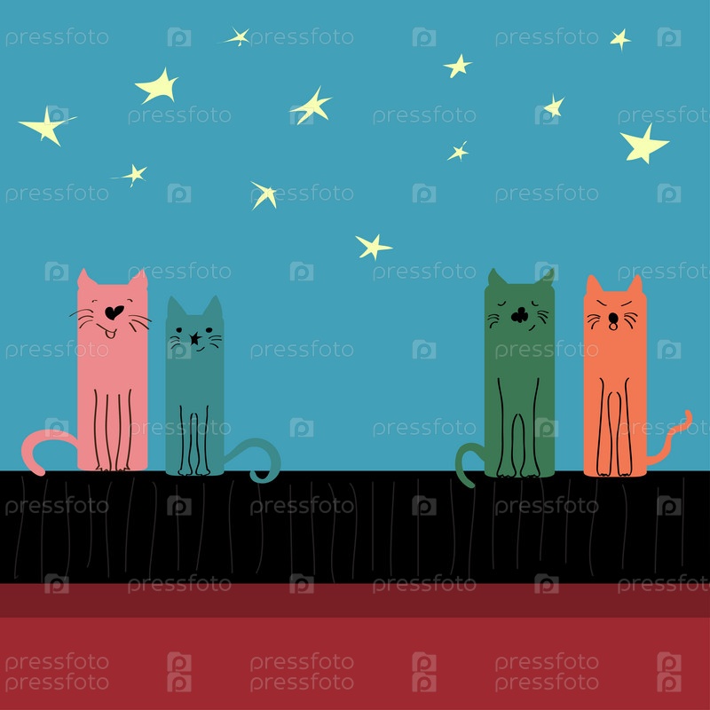 Цветные кошки сидят на крыше