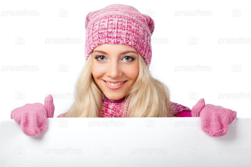Блондинка держит лист белой бумаги
