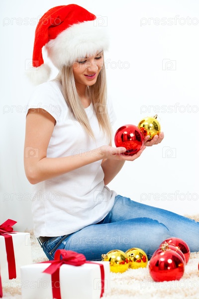 Счастливая женщина в колпаке Санты сидит на ковре