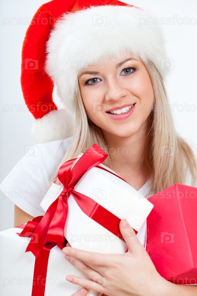 Счастливая женщина в колпаке Санты с подарками