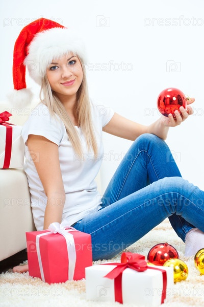Счастливая женщина в колпаке Санты сидит на полу