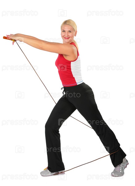 Девушка делает упражнения с веревкой на белом фоне