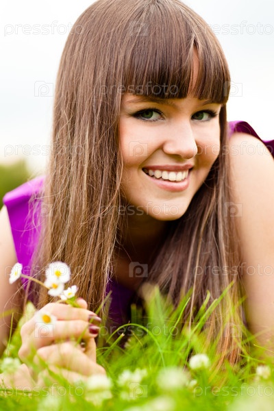 Девушка лежит на цветочном лугу